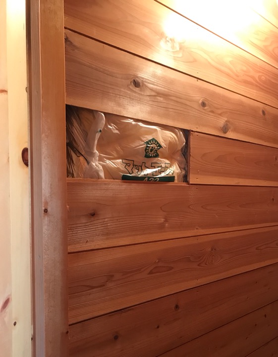 我が山小屋の2階はログではなく在来工法です。板壁なので打ち込まれている釘の位置を見て切り始める場所をさがします。