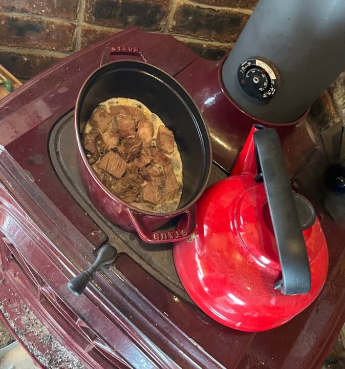 暮れから準備していた牛のサイコロ状のスネ肉の冷凍を前日から薪ストーブで煮込みました。