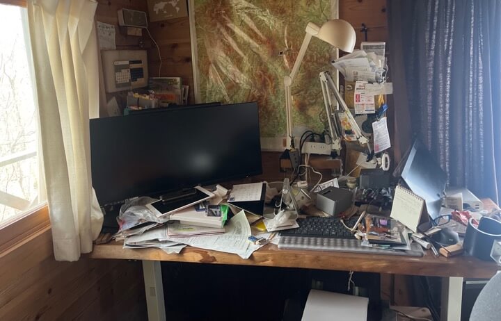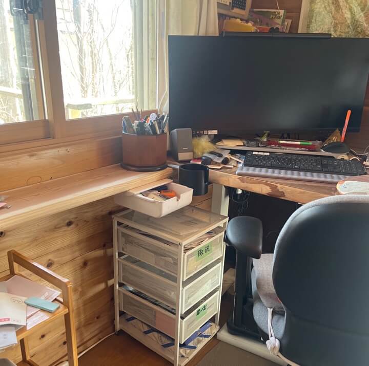 あーゆーのっていいな、と思い、なんと我が小屋に戻って来てからすぐ机を動かすことを考えました。