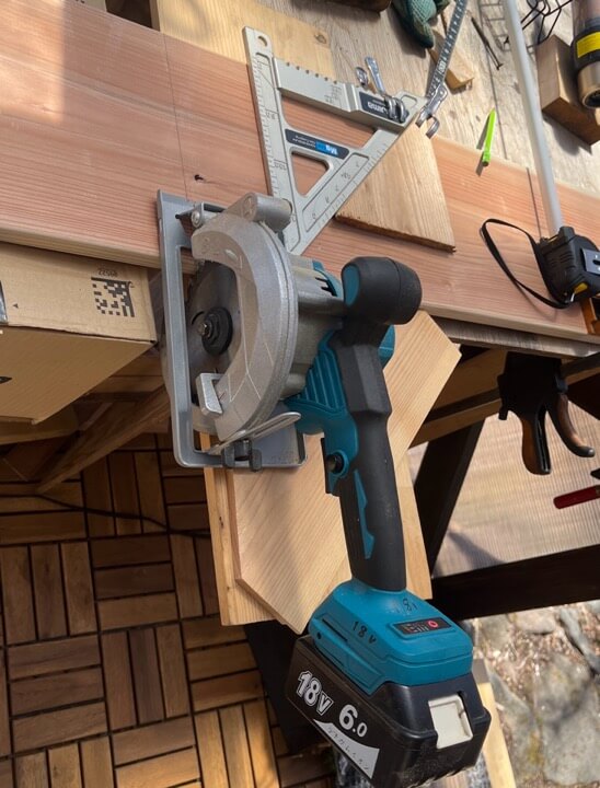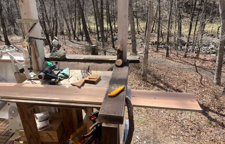 作業台はベランダ南西に置いてあるので、材を西の手すりの外にはみ出して伸ばせるようにしました。