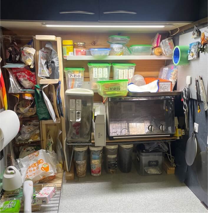 IKEAの金属棚と1X4材で自作した縦長の棚などで袋物(ココア、紅茶、ふりかけ、即席味噌汁、スープなど)を収納。