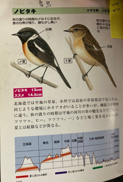 ともに夏鳥で、図鑑による分布図だとノビタキの方がかなり高度地帯(2000m前後)にいるようだが、ここ1400mではどうなのか。
