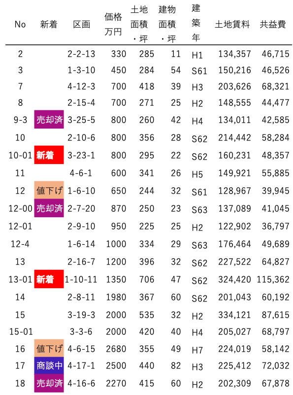 (2023/6/8) 3件新着です。また1件商談中でした。売約済は消えています。